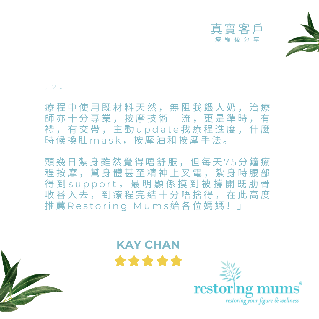 我們以健康為首要的純手法按摩帶給媽媽們「健康瘦身」,不僅能舒緩繃緊肌肉,放鬆心情,這更加是革命性的改造體驗。自2011年,一直深受不少媽媽的信賴,提供安全、優質和有效的產後紮身療程。